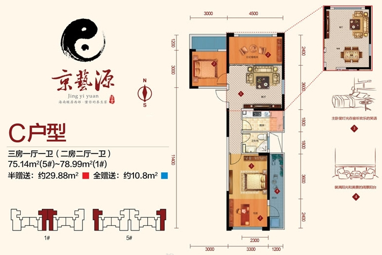 京藝源C户型图3室1厅1卫0厨建筑面积:75.14㎡(建筑面积:75.14㎡)