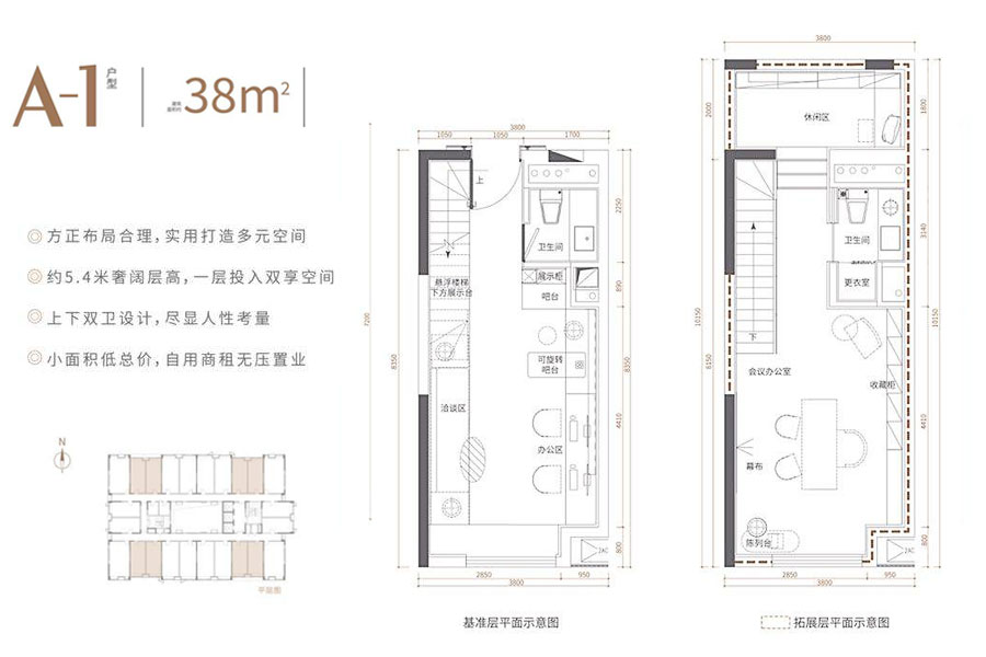 A-1户型-2房1厅2卫-建面约38.00㎡(建筑面积:38.00㎡)