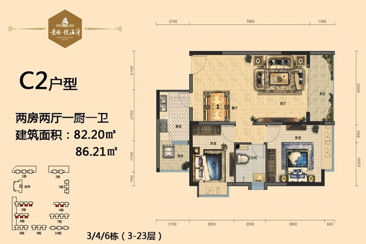 C2户型-2房2厅1厨1卫-82.20-86.21㎡(建筑面积:㎡)