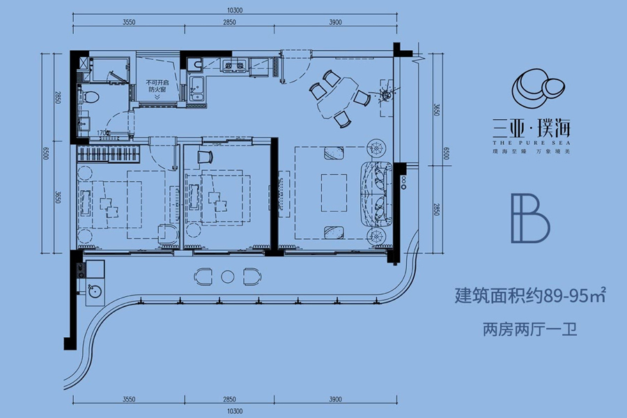 三亚璞海-B1户型-建面约89-95平-两房两厅(建筑面积:89㎡)
