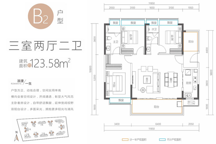 B2户型-三房两厅两卫 123.58平(建筑面积:123.58㎡)