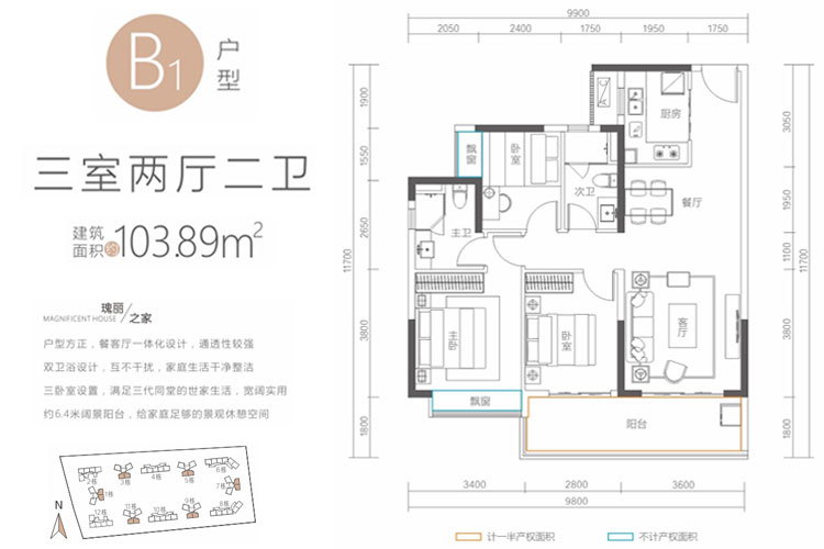 B1户型-三房两厅两卫 103.89平(建筑面积:103.89㎡)