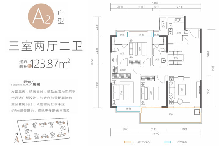 A2户型-三房两厅两卫 123.87平(建筑面积:123.87㎡)
