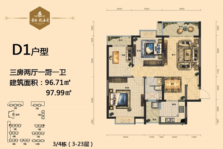 D1户型-3房2厅1厨1卫-96.71-97.99㎡(建筑面积:㎡)