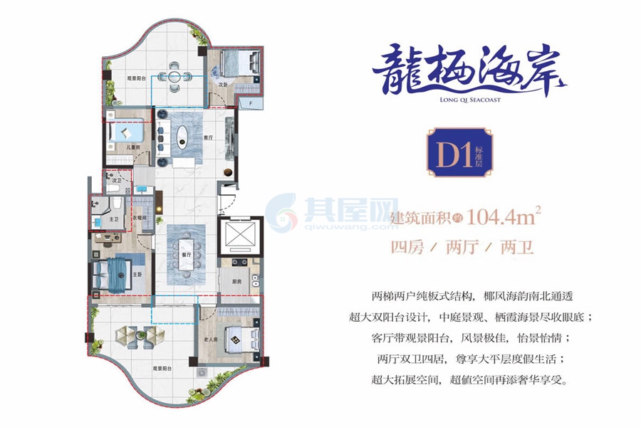 清凤龙栖海岸两梯两户纯板式住宅在售,建面为103平米四房户型,实得面积为190-222平米,总价220万/套 清凤龙栖海岸销售部免费咨询电话 0898-66684499 二十四小时免费专车看房