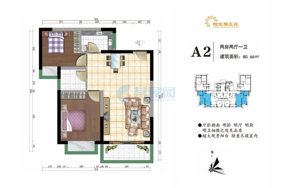 A2户型-建面约80.66平米-两房两厅(建筑面积:80.66㎡)