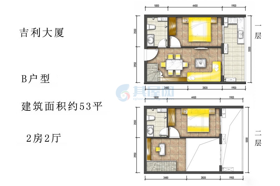 B户型-建面约53.00㎡-2房2厅2卫(建筑面积:53.00㎡)