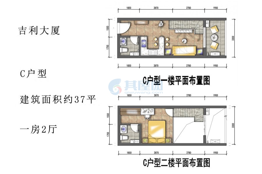C户型-建面约37.00㎡-1房2厅2卫(建筑面积:37.00㎡)