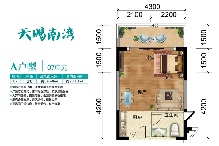 天赐南湾A户型1室0厅1卫1厨(建筑面积:34.40㎡)
