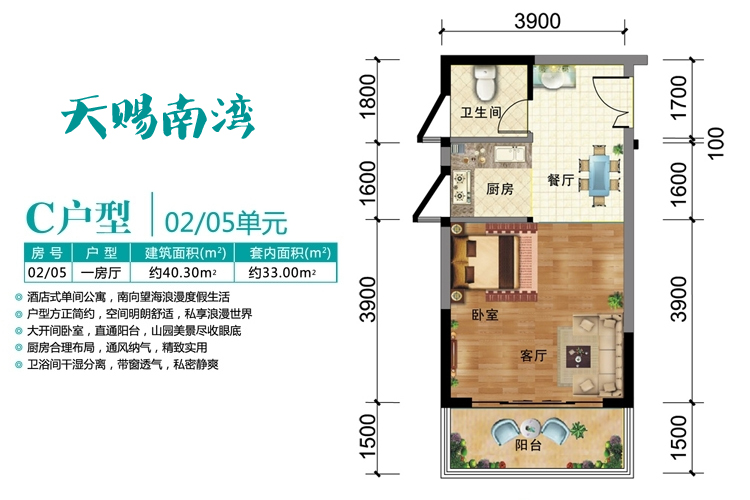 天赐南湾C户型1室0厅1卫1厨(建筑面积:40.30㎡)