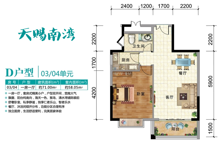 天赐南湾D户型1室1厅1卫1厨(建筑面积:71.00㎡)