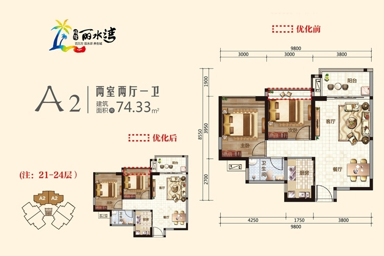 项目规划有高层瞰海公寓、风情洋房、奢华别墅等。目前主打户型为60-70平的小户型,一房可变两房且赠送面积大。