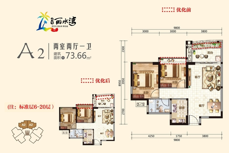 三期标准层A2户型图-2室2厅-建筑面积:73.66㎡(建筑面积:73.66㎡)