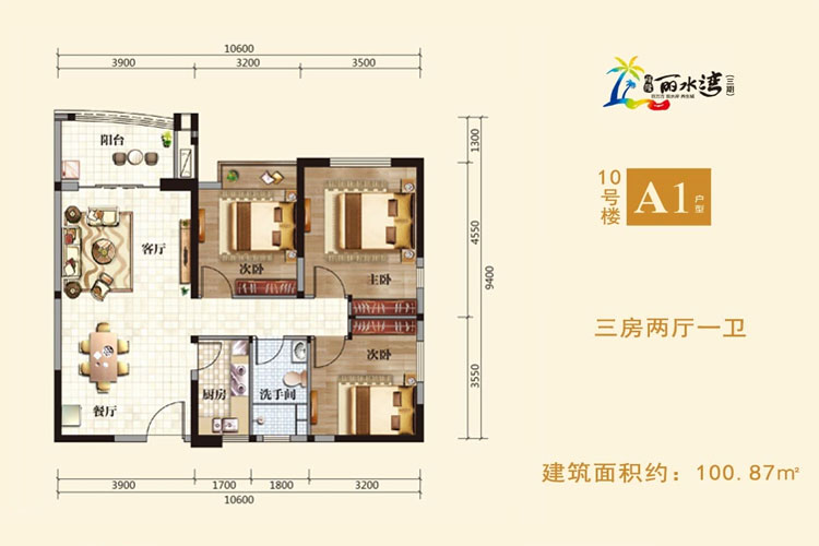 三期10号楼A1户型-建面约100.87平-三房两厅(建筑面积:100.87㎡)