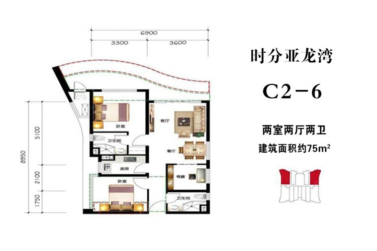 C2-6户型约75平米(建筑面积)两室两厅(建筑面积:75㎡)
