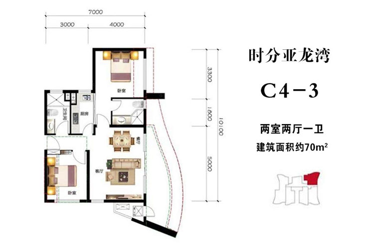 C4-3户型约70平米(建筑面积)两室两厅(建筑面积:70㎡)