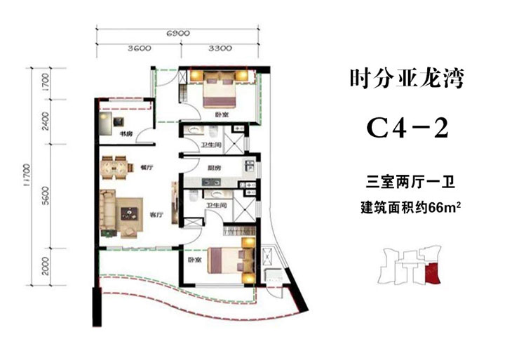C4-2户型约66平米(建筑面积)三室两厅(建筑面积:66㎡)