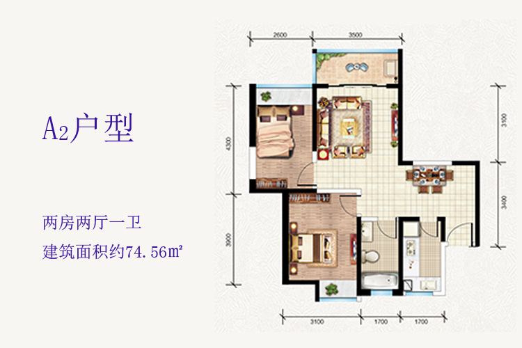 A2户型-建面约74.56平米-两房两厅(建筑面积:㎡)