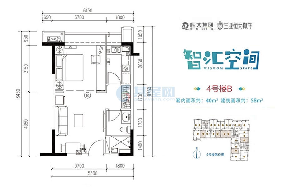 智汇空间B户型-建面约58㎡-单间(建筑面积:58㎡)